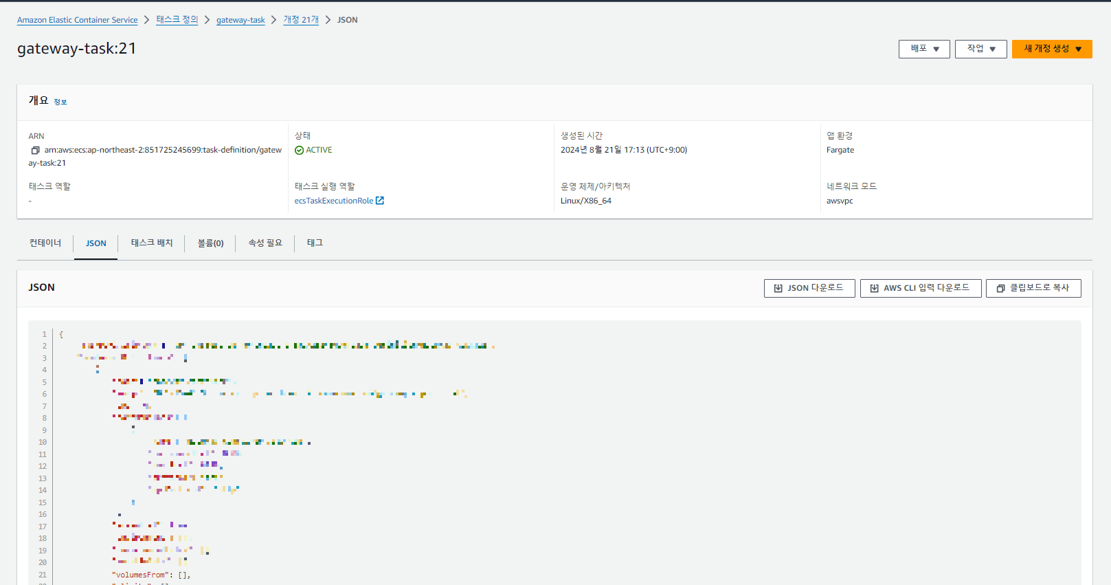 아까 만든 task에서 JSON > AWS CLI 입력 다운로드 클릭