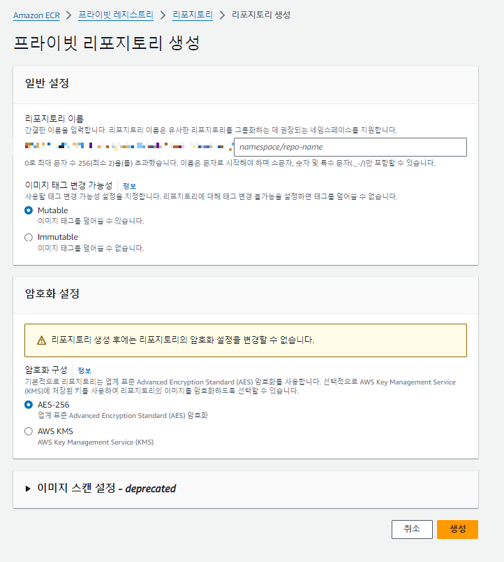 Private registory > Repositories > 리포지토리 생성 클릭