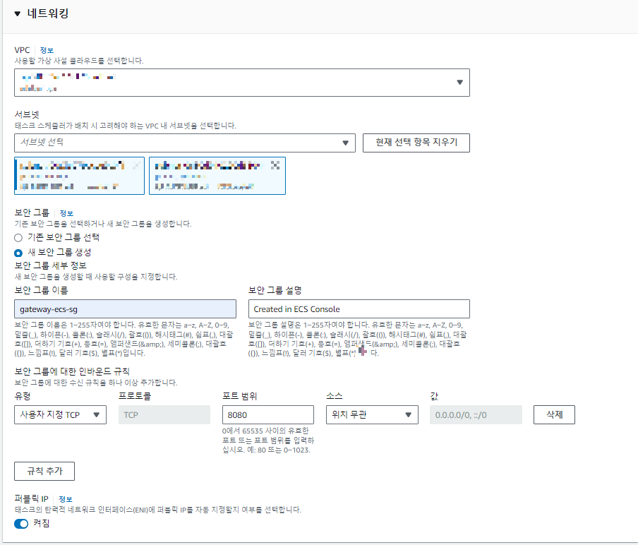 위와 같은 에러는 현재 접근하고 싶은 service security 인바운드 규칙에 해당 container포트, 즉 8080을 추가 안해줘서 생긴일이다.